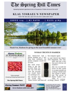 Click below to download this week’s issue of The Spring Hill Times. Inspired by ‘A Life with Bitachon’. The Spring Hill Times Issue 114 Ki Savo Listen to the Powerful, Daily-Updated Shiurim that have inspired tens of thousands by R’ Zevy Golombeck on ‘A Life with Bitachon’. Eretz Yisroel 079-704-0068 Lakewood 732-719-3898 Monsey 845-470-5577 Five Boroughs 929-470-5577 England 03-303-502-368 Australia (3) 99-997-300 Canada 647-498-7700 Read more: The Spring Hill Times Issue 115 Nitzvim Vayeilech 5783