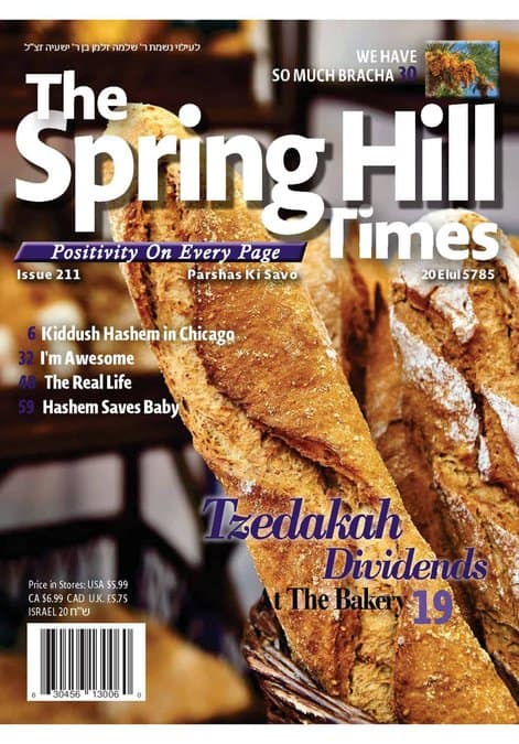 The Spring Hill Times Issue 211 Ki Savo 5785$2.50The Spring Hill Times is a newspaper focused on happy positive news, with a special focus on how wonderful Hashem is to us. The reader will also get a glimpse of the greatness of Hashem and the greatness of Klal Yisrael. The newspaper also puts a special emphasis on Bitachon and Hashgacha Pratis.