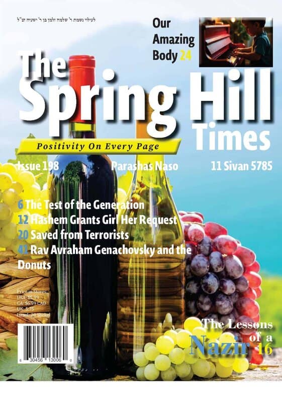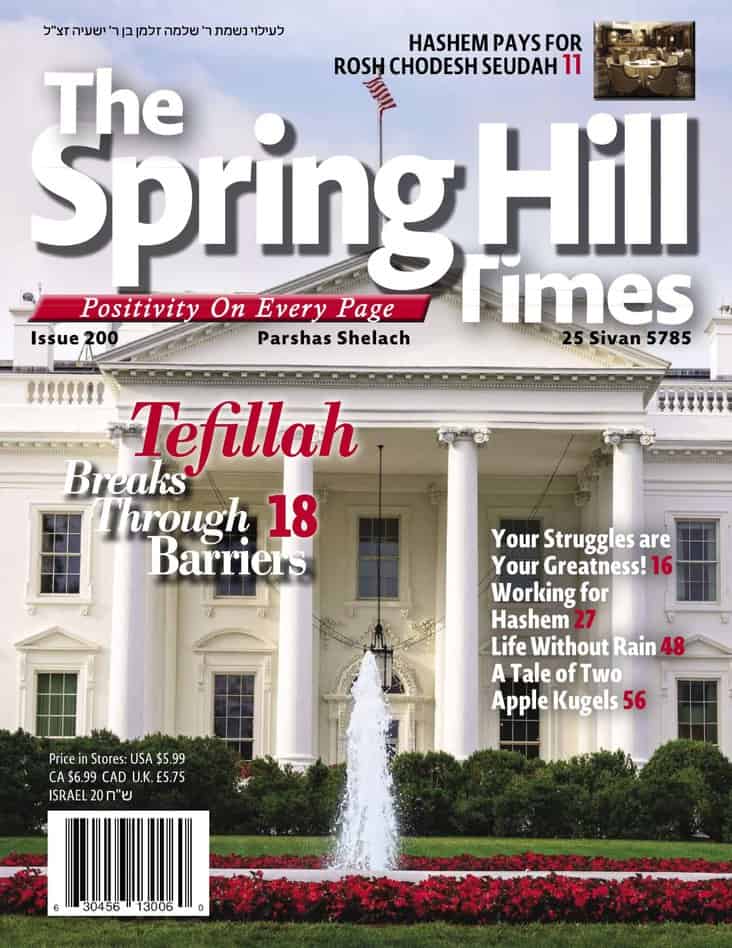 The Spring Hill Times Issue 199 Behalosecha 5785$2.50The Spring Hill Times is a newspaper focused on happy positive news, with a special focus on how wonderful Hashem is to us. The reader will also get a glimpse of the greatness of Hashem and the greatness of Klal Yisrael. The newspaper also puts a special emphasis on Bitachon and Hashgacha Pratis.