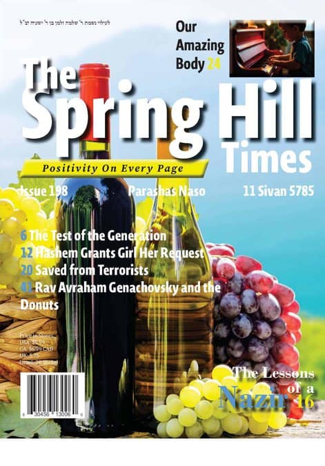 The Spring Hill Times Issue 198 Naso 5785$2.50The Spring Hill Times is a newspaper focused on happy positive news, with a special focus on how wonderful Hashem is to us. The reader will also get a glimpse of the greatness of Hashem and the greatness of Klal Yisrael. The newspaper also puts a special emphasis on Bitachon and Hashgacha Pratis.