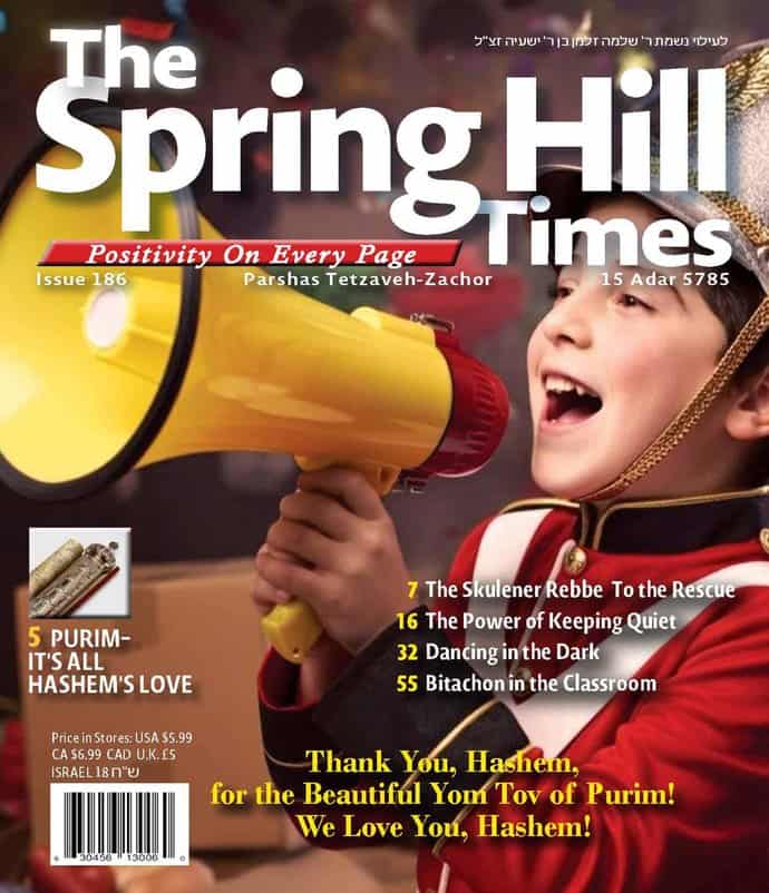 The Spring Hill Times is a newspaper focused on happy positive news, with a special focus on how wonderful Hashem is to us. The reader will also get a glimpse of the greatness of Hashem and the greatness of Klal Yisrael. The newspaper also puts a special emphasis on Bitachon and Hashgacha Pratis.