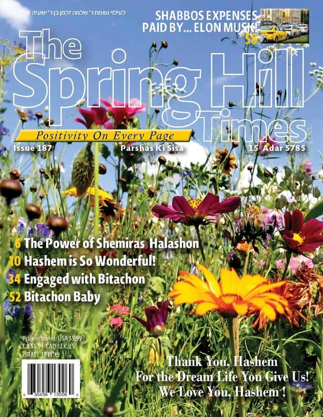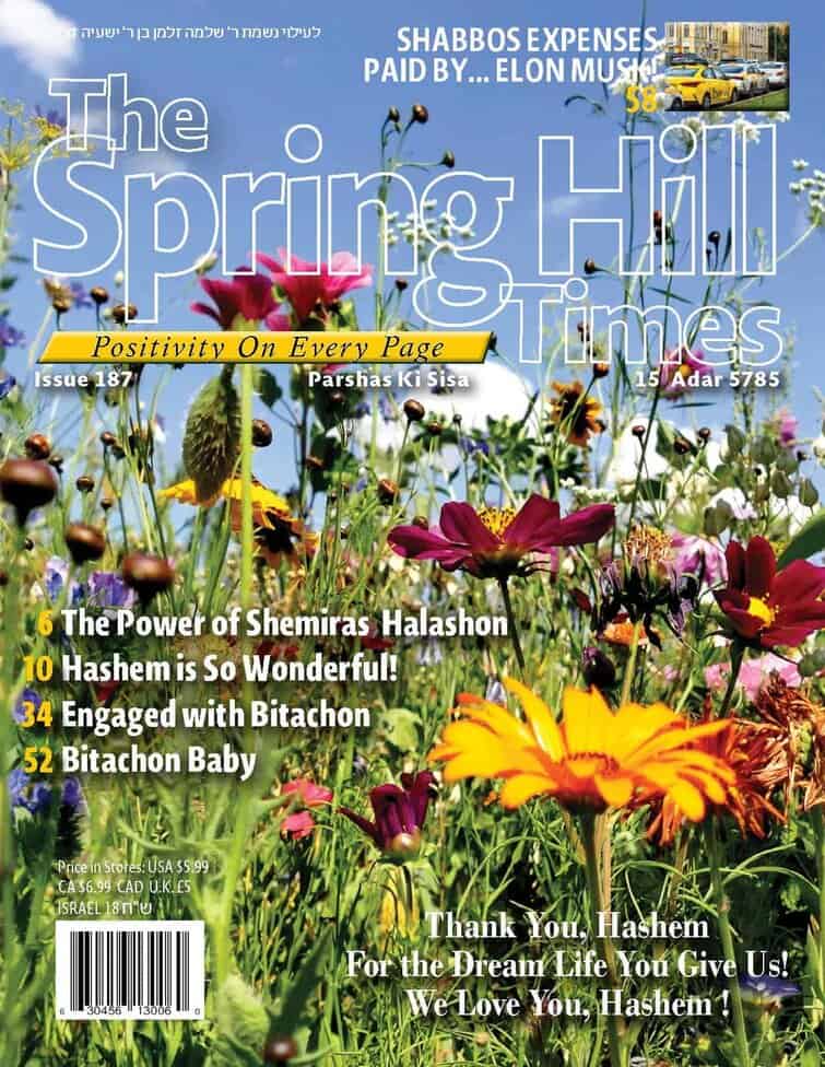 The Spring Hill Times is a newspaper focused on happy positive news, with a special focus on how wonderful Hashem is to us. The reader will also get a glimpse of the greatness of Hashem and the greatness of Klal Yisrael. The newspaper also puts a special emphasis on Bitachon and Hashgacha Pratis.