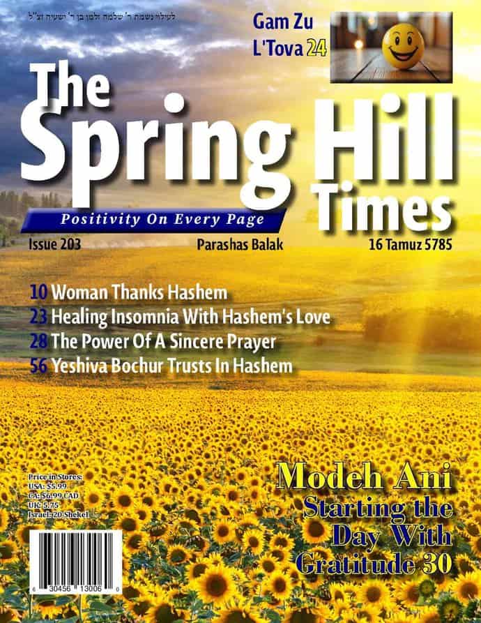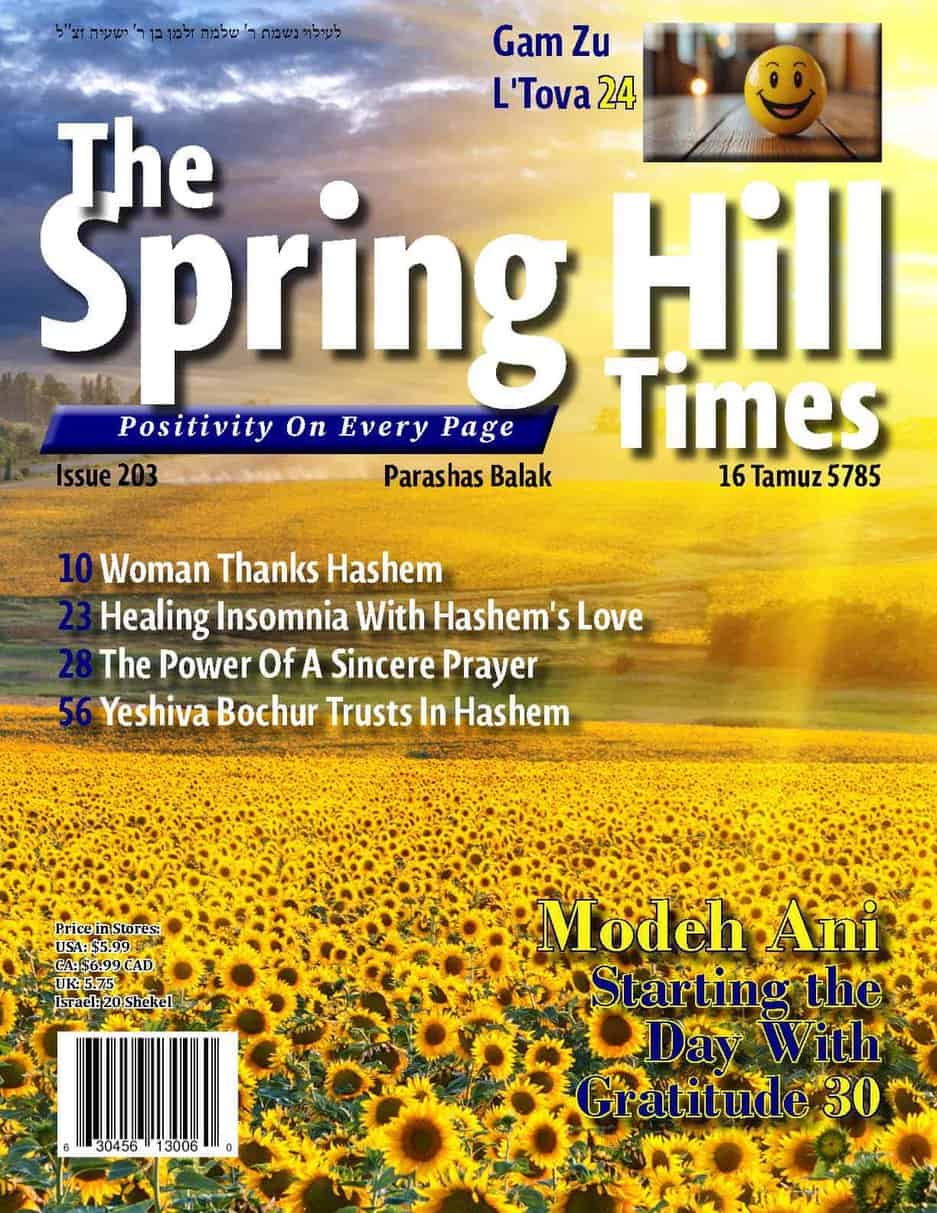 The Spring Hill Times is a newspaper focused on happy positive news, with a special focus on how wonderful Hashem is to us. The reader will also get a glimpse of the greatness of Hashem and the greatness of Klal Yisrael. The newspaper also puts a special emphasis on Bitachon and Hashgacha Pratis.